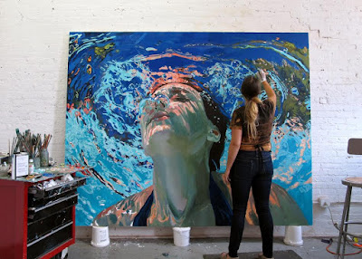 Samantha French’s poolscapes shimmer and vibrate with patterned segments of intense color and barely paused, floating movement. It achieves this through a neat combination of appearing absolutely real to the eye while being a very obvious quilt of pigmented canvas. French manages to convey playfulness and the eternal buoyant freedom of summer, the cool loosening from the heavy world around of us of heat and gravity into a suspended dream. The work is accomplished and joyful.